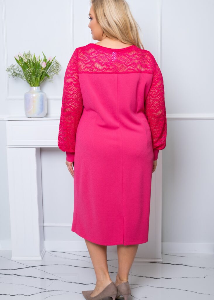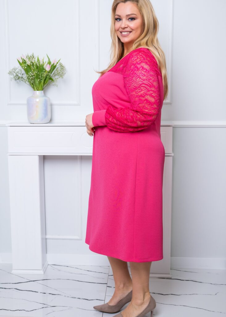 Malinowa elegancka sukienka EMMA to pomysłowe połączenie klasycznego kroju z  koronkowymi rękawami. Została stworzona z myślą o kobiecej sylwetce plus size, a dekolt w kształcie litery V pięknie wysmukla szyję i pozwala pokazać ulubioną biżuterię. Wykończenie sprawa, że ta elegancka sukienka nie jest przeciętna, a Ty będziesz wyglądała szykownie. Sukienka nie ma kieszeni ani podszewki, a jej krój jest lekko dopasowany, dzięki czemu podkreślisz swoje atuty!