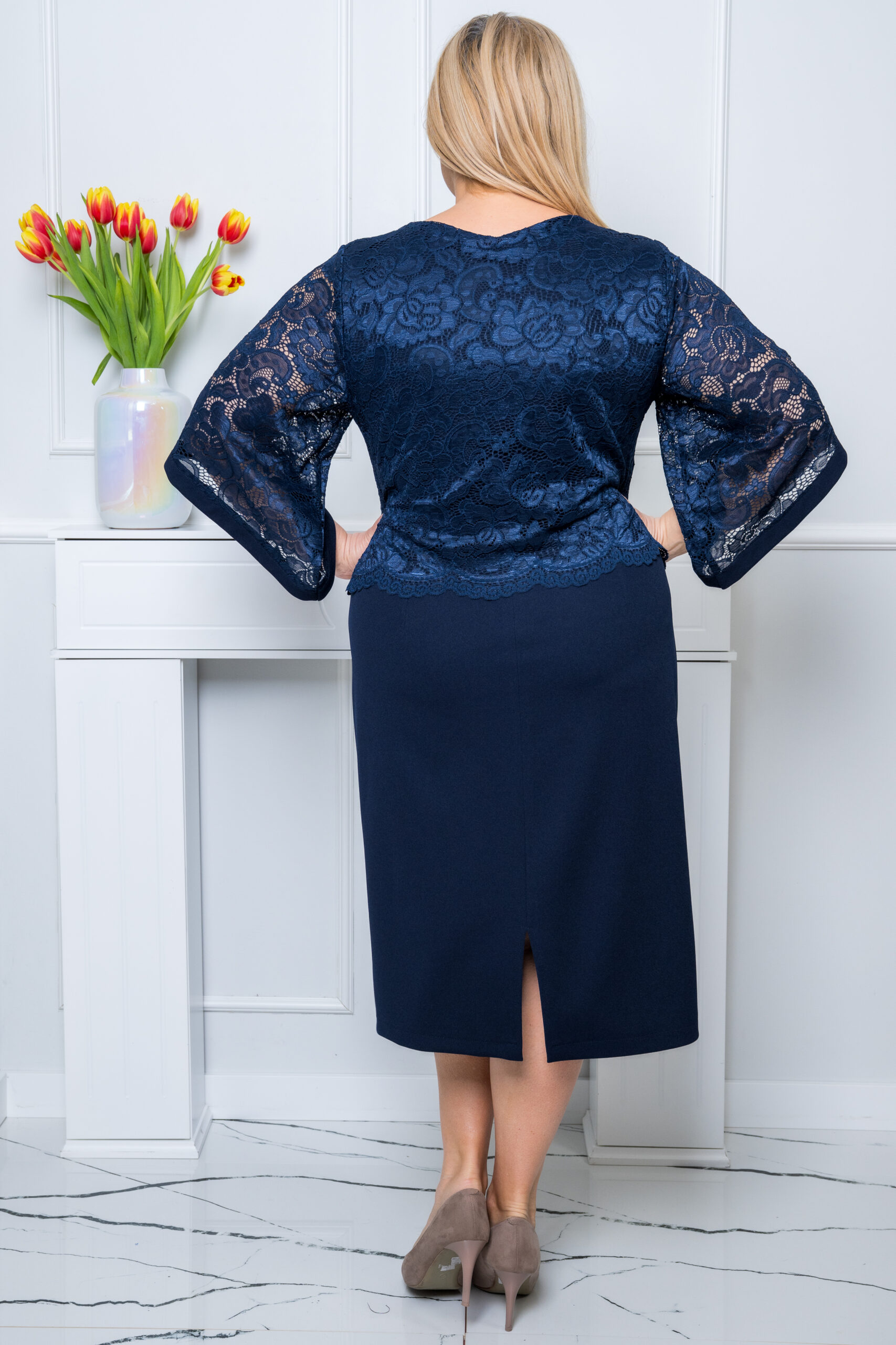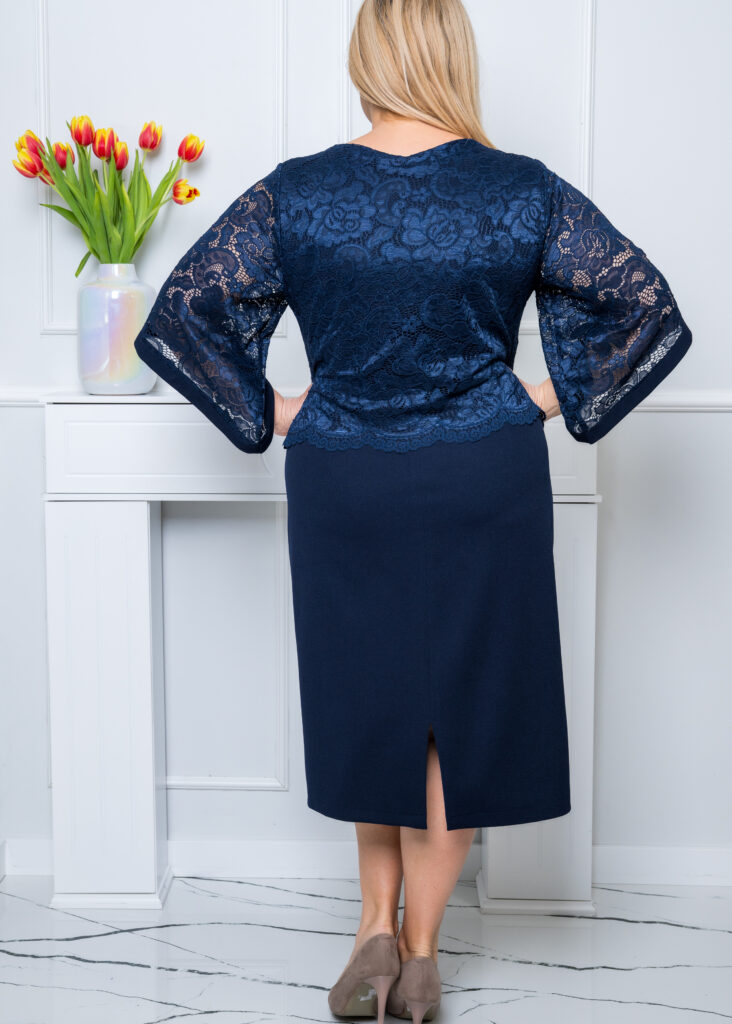 Granatowa, elegancka sukienka Olga to pomysłowe połączenie klasycznego kroju z modną koronką. Koronka jest naszyta na górną część sukienki (nic nie prześwituje), nie ma cięcia w talii.