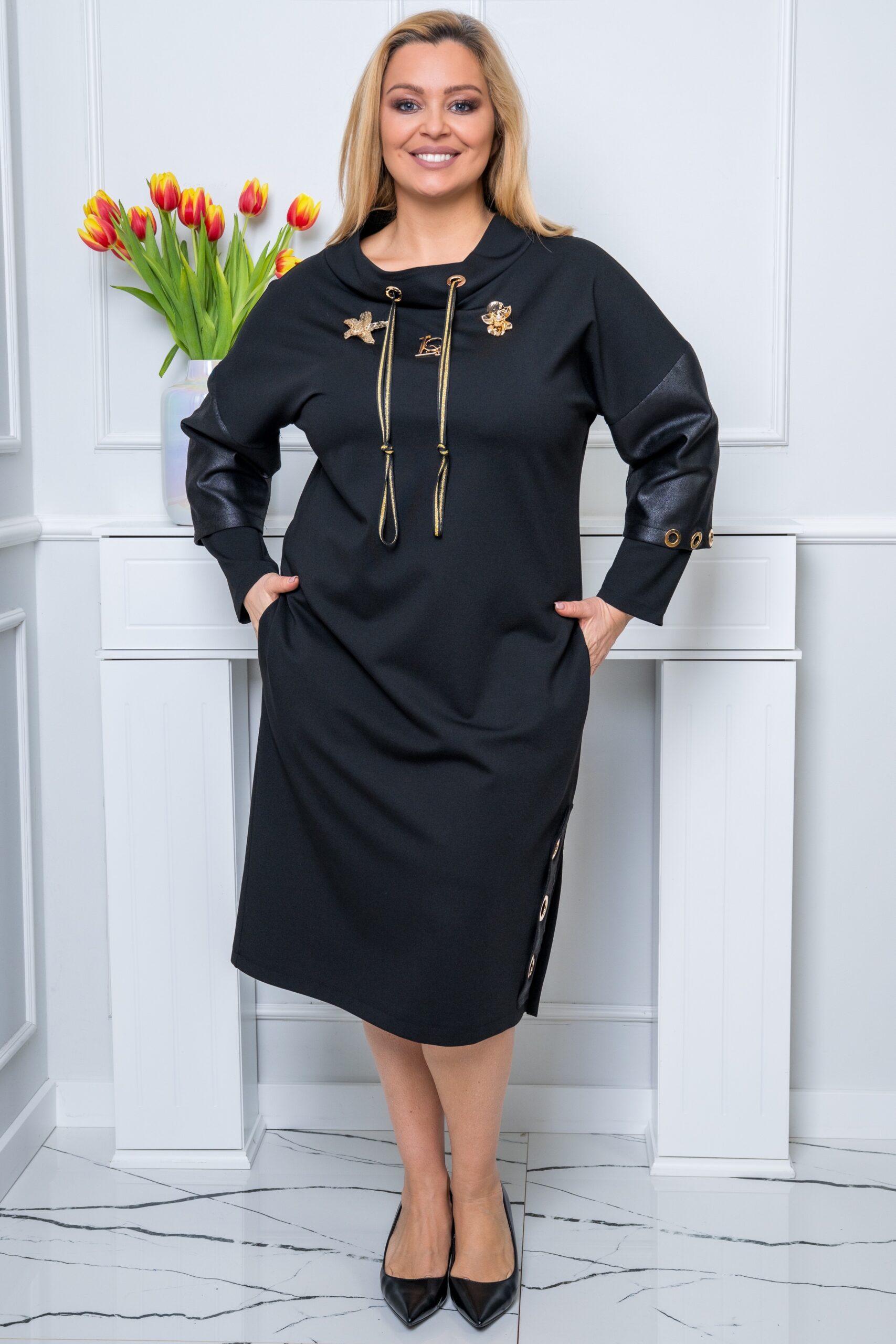 Sukienka POLA w lekko sportowym stylu to przyciągająca uwagę propozycja na codzienne spacery, spotkania czy do pracy. Materiał zapewnia swobodę ruchów, komfortowa długość sukienki za kolanko, kieszenie na drobne skarby sprawią, że ją pokochasz. Trzy złote broszki widoczne przy dekolcie nie są w komplecie – można je zakupić osobno.