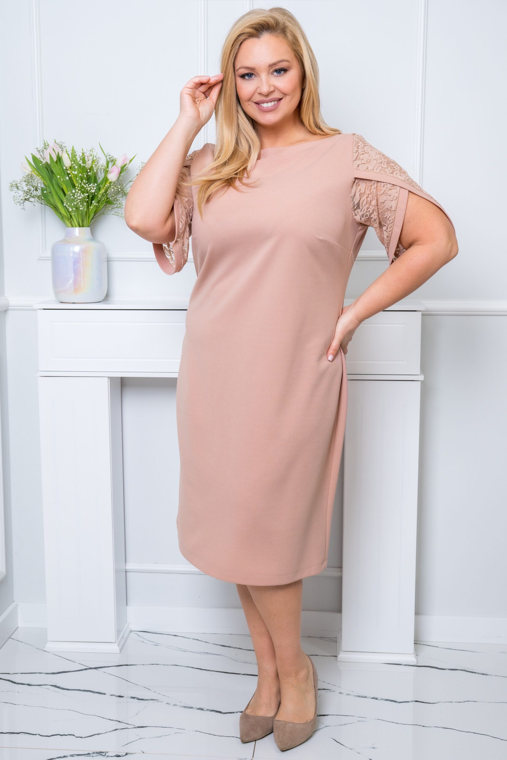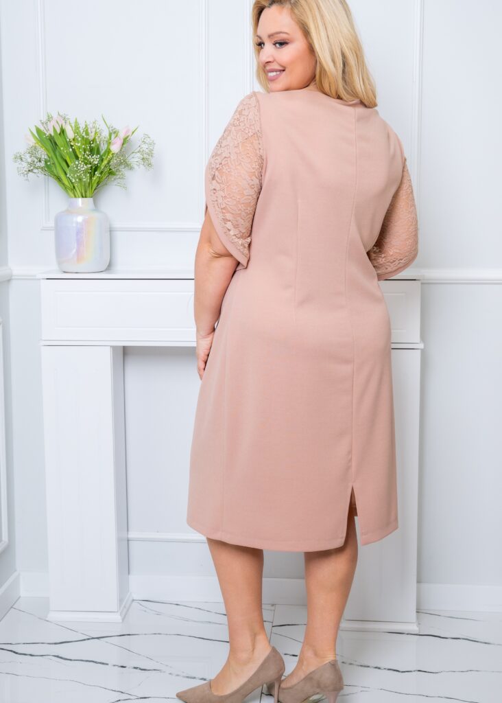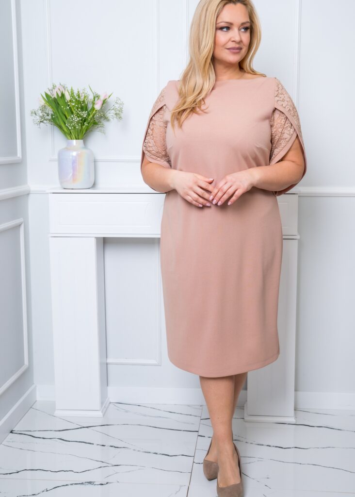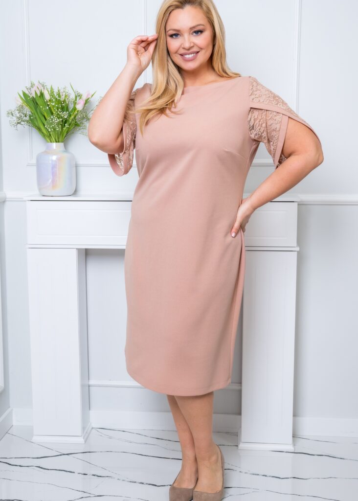 Beżowa sukienka Vivien to pomysłowe połączenie klasycznego kroju z  modną koronką. Została stworzona z myślą o kobiecej sylwetce plus size. Wykończenie sprawa, że ta elegancka sukienka nie jest przeciętna, a Ty będziesz wyglądała szykownie. Sukienka nie ma kieszeni ani podszewki, a jej krój jest lekko dopasowany, dzięki czemu podkreślisz swoje atuty!